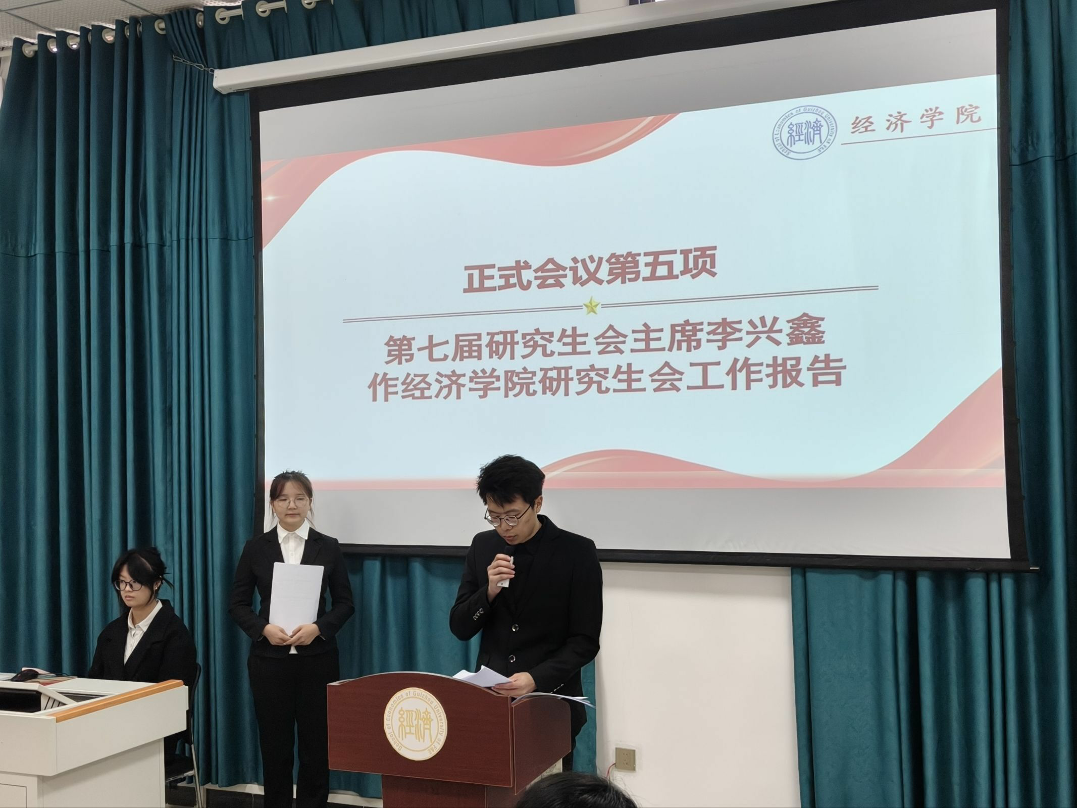 (图4:第七届研究生会主席李兴鑫同学作经济学院研究生会工作报告)