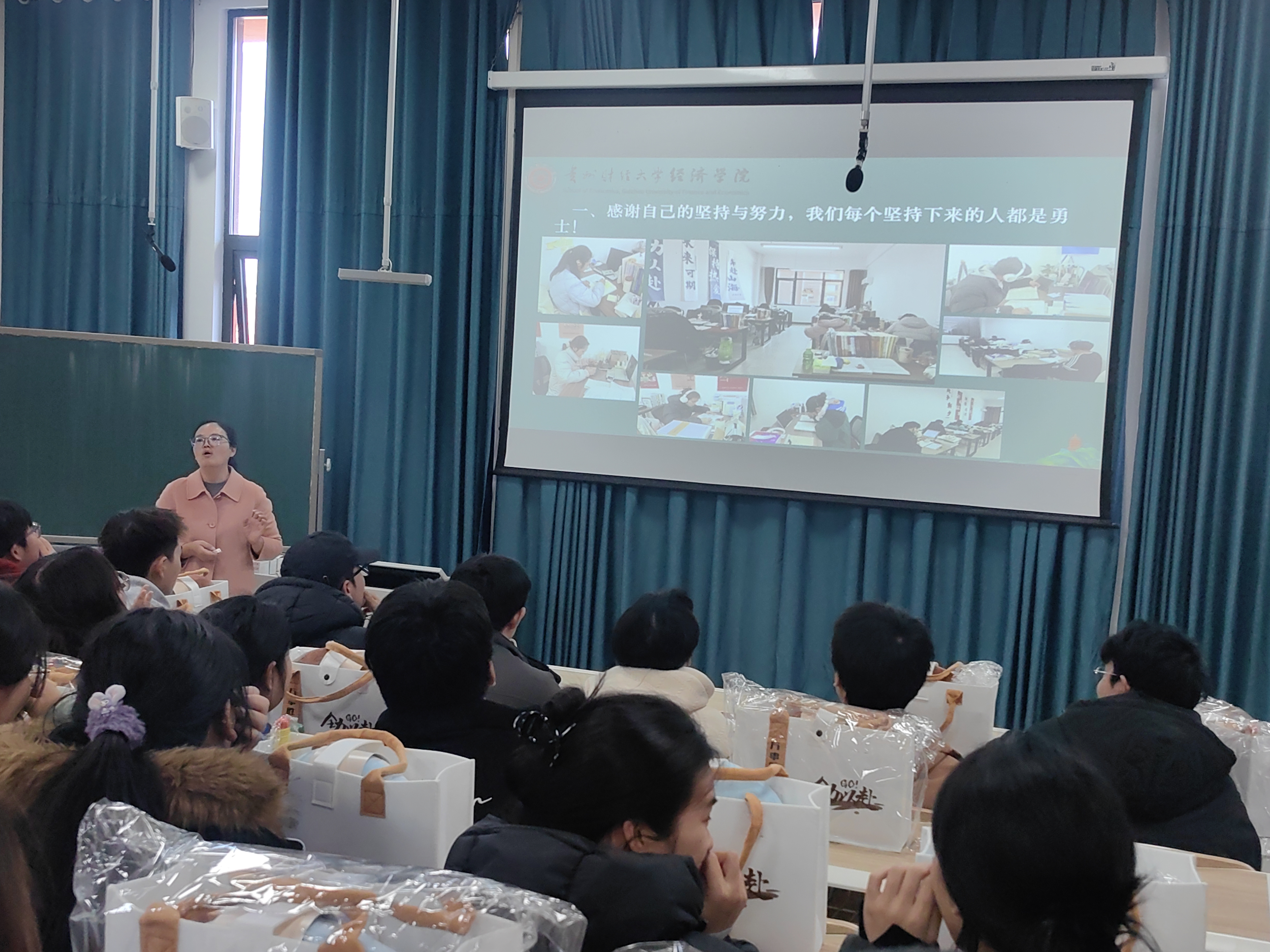 (来源:刘梦燕 图文报道)为鼓舞考研学子士气,坚定备考信心,缓解冲刺阶段的压力,经济学院于2025年11月26日在文思阶教2-1精心组织了2026届考研慰问活动。经济学院党委书记陈劲松、副院长(主持行政工作)李顺毅、学院大学生校园危机事件预警应对工作室负责人杨志远、26届辅导员刘梦燕与全体26届考研学生共同参与了此次活动。