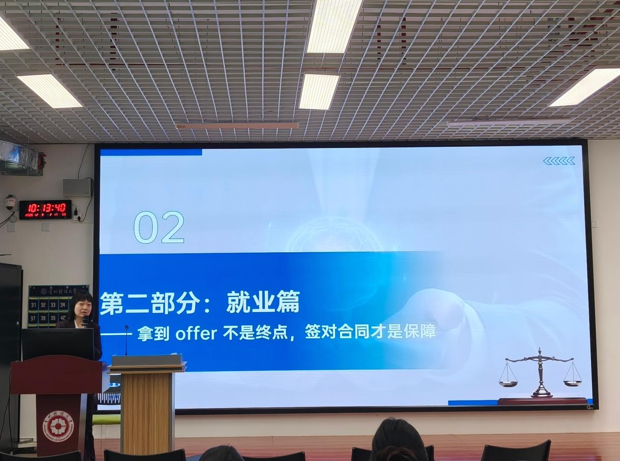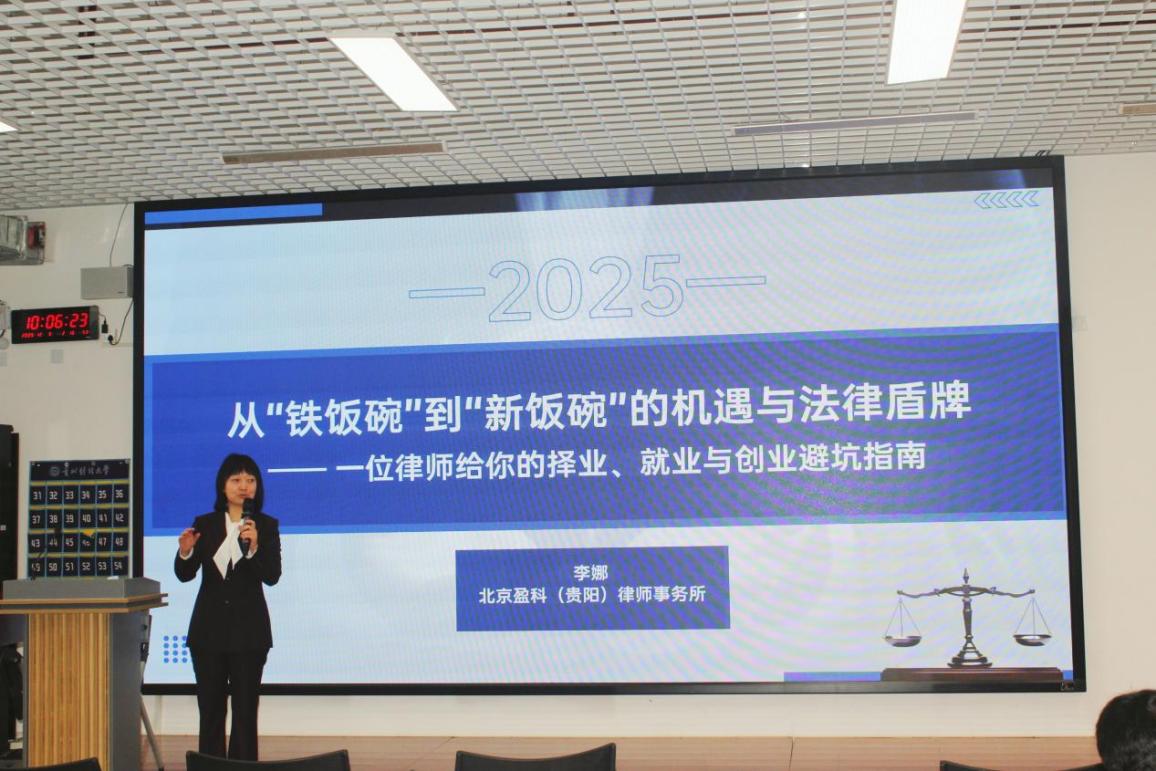 (来源:符莉欣 于悦 图文报道)2025年12月9日,贵州财经大学经济学院在文正楼108开展“一二·九”系列就业引航树立正确就业观主题团日活动。本次活动由经济学院承办,北京盈科(贵阳)律师事务所李娜律师以及2022级经济学院学生代表参与本次活动。本次活动旨在向同学们介绍当前就业形势,让同学们更好规避风险实现就业。从划定权利边界到维护社会秩序,法律是权力的约束线、权利的保障网、发展的压舱石。
