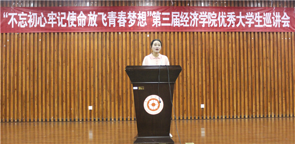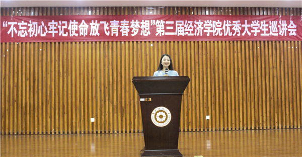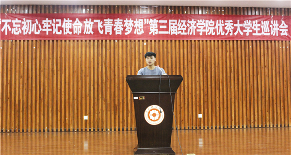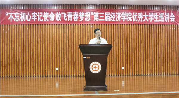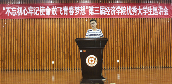 首先是由经济学院陈波书记致辞。他强调,青少年是有梦想的时代,在大学四年,大家要树立奋斗目标、立足现在、展望美好未来、不忘初心、牢记使命,明白自己该做什么,为什么要这样做。这些都是应该规划的,希望将来的各位像六位学长学姐们一样,有属于自己的精彩生活。