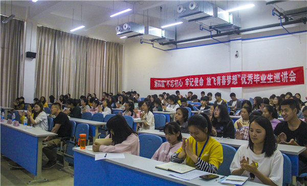 2019年5月13日下午,经济学院第四届“不忘初心 牢记使命 放飞青春梦想”优秀毕业生巡讲会在进学楼1-2、进学楼2-2举行。优秀毕业生代表阮福义、易宏克、刘娜、李小庆、杨蓉、吴秋婷、袁琳燕、陈娜、刘剑、刘鸣、郭战通、梁永坚、杨金晶分别分享了自己的大学感悟以及经验,经济学院17级和18级的全体学生参加了此次巡讲会。